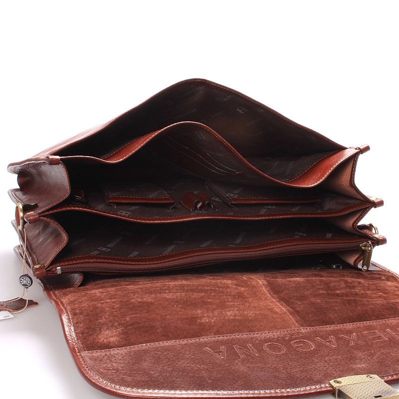 Pánská koňakově hnědá luxusní celokožená aktovka Hexagona s klopou. Uvnitř – rozdělená na tři hlavní kapsy, dále kapsičky na mobil, tužky, drobnosti bez zipu, v zadní přihrádce je kapsa na zip. Zepředu – pod klopou kapsa bez zipu. Zezadu – kapsa na zip. Součástí aktovky je popruh. Do aktovky se vleze notebook s max. rozměry 37 x 26 cm.