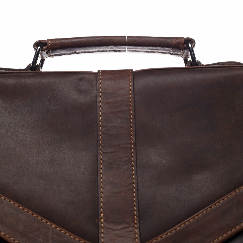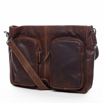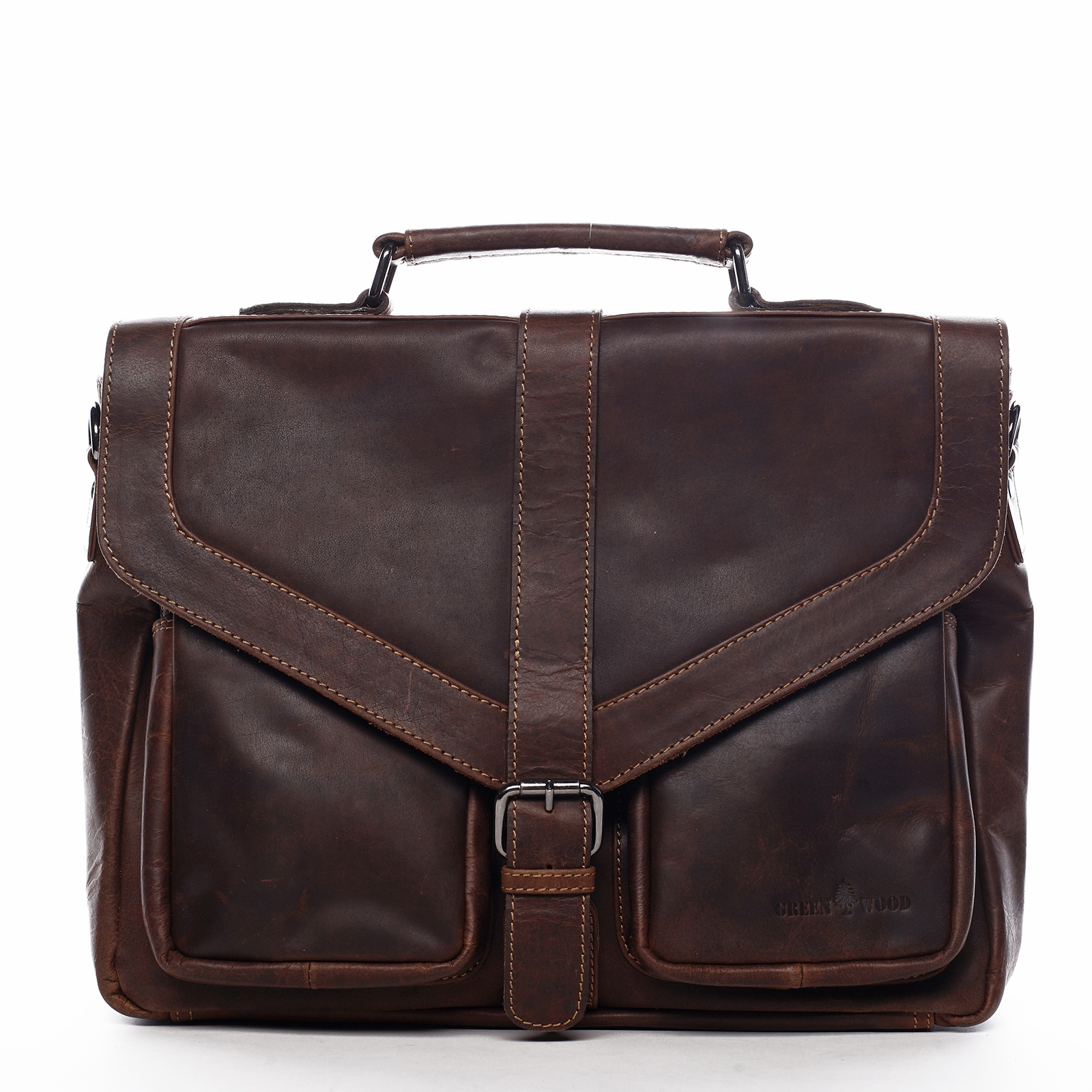 Luxusní kožená brašna v designu aktovky má tmavě hnědou barvu, kůže je přírodní, jemně broušená. Značka Greenwood dodává kvalitní a jedinečné pracovní doplňky a tato taška je jednou z nich. Klopa do písmene "V" se otevírá klasickým klipsem, který je přišit na řemínku. Pod klopou jsou dvě středně velké kapsy se zipem. Brašna má dvě hlavní volné kapsy, uvnitř kterých najdete místo na spisy, dokumenty, notebook (max. 35 x 26 cm) i přihrádky na telefon, vizitky či propisky. K dispozici Vám budou také kapsy se zipy z vnitřní i vnější části zadní strany. Nosit ji můžete v ruce za celkem pevné plošší ucho nebo s popruhem přes rameno. Objednejte ještě dnes a vyzkoušejte, vrátit ji můžete až za 30 dnů! Drobné škrábance či oděrky nejsou závadou kůže, časem a užíváním získají svůj individuální charakter a patinu. Veškeré produkty z broušené kůže je třeba impregnovat a mazat, vydrží Vám mnohem déle.