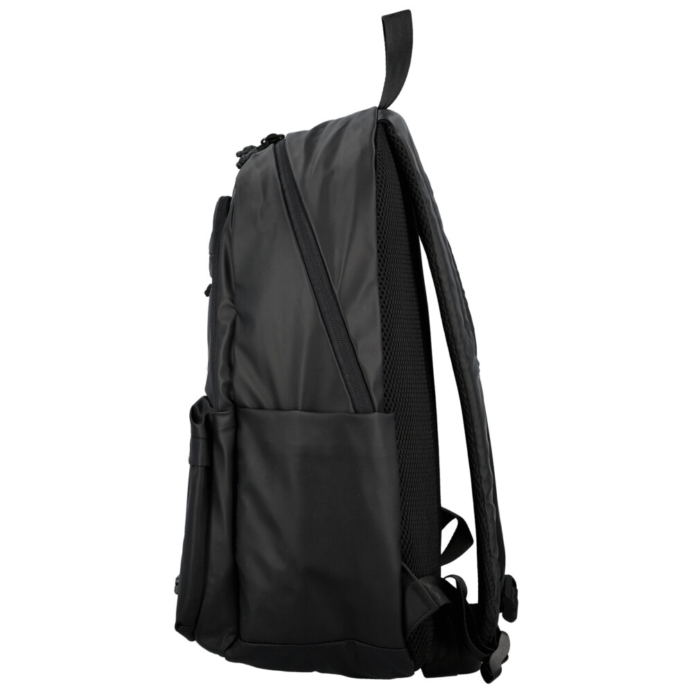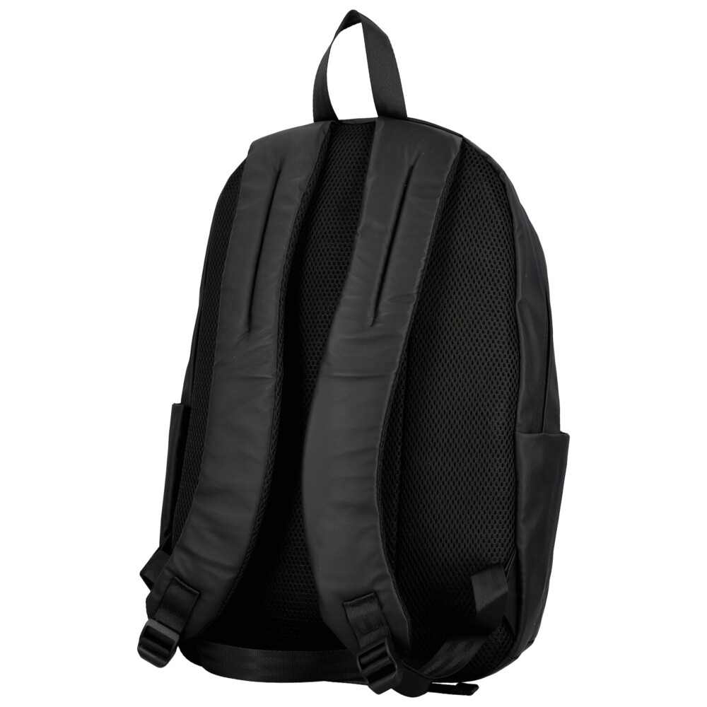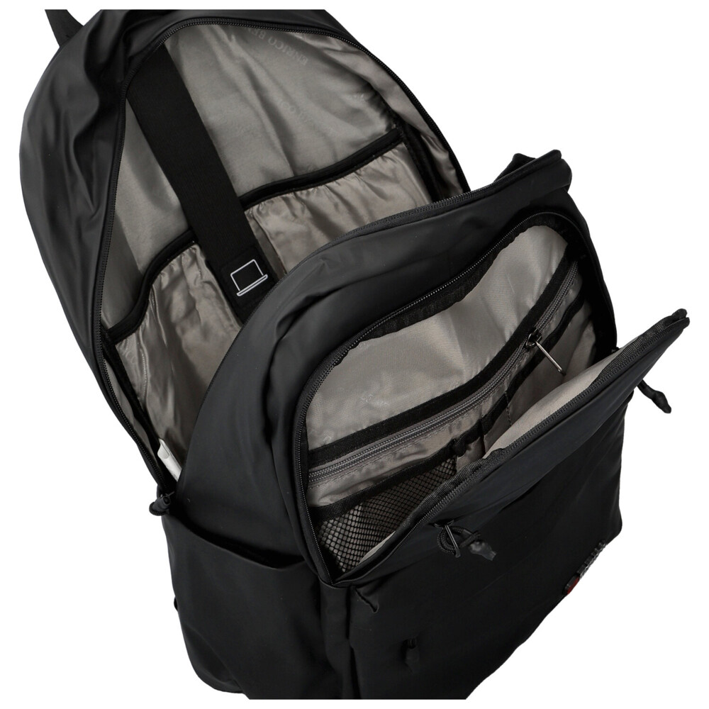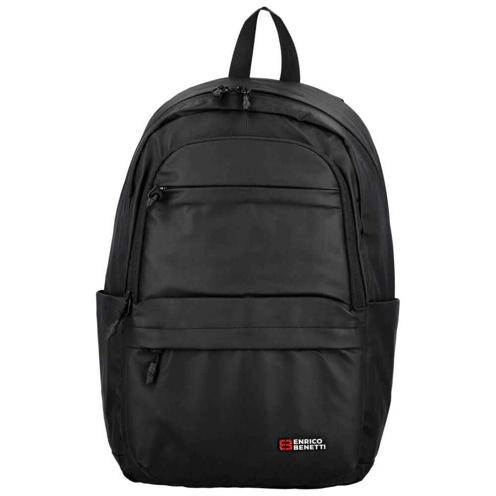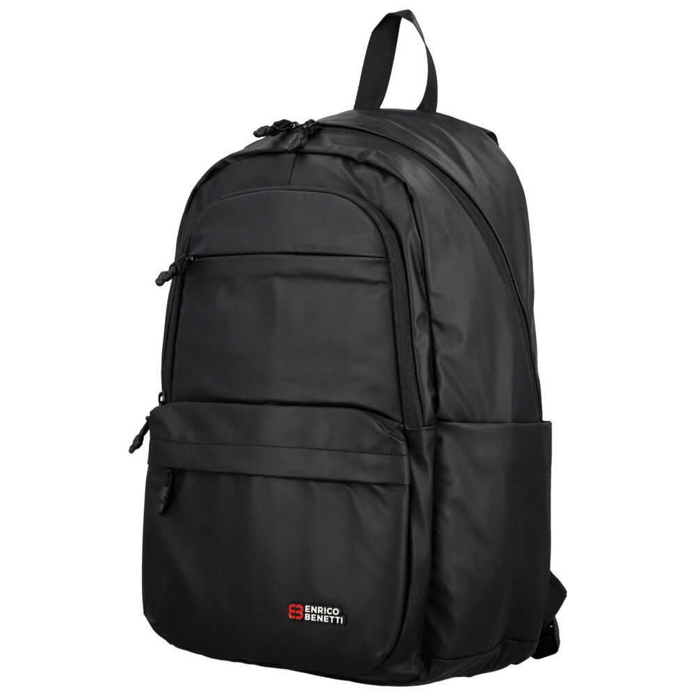 Černý pogumovaný batoh Enrico Benetti je moderním a zároveň vysoce praktickým doplňkem pro každodenní nošení. Hlavní komora se otevírá oboustranným zipem a uvnitř ukrývá bezpečnou přihrádku na 15" notebook, která chrání zařízení během cestování i přesouvání do školy či práce. Druhá menší kapsa na jednostranný zip nabízí praktický organizér – menší zipovou kapsičku, síťovanou přihrádku a sekci na propisky či malé doplňky.