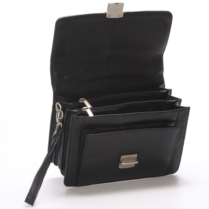 Pánské černé kožené etue s klopou na zámeček a výsuvným uchem. Uvnitř tři hlavní přihrádky plus jedna přihrádka na přední straně. Další dvě jsou na zip. Etue pojme peněženku, telefon, klíče a další nezbytné věci. Zezadu další kapsička na zip. Součástí je kožené poutko na ruku. !Pozor! Klíčky k zamykání etue nemusí být součástí modelu momentální kolekce.
