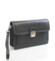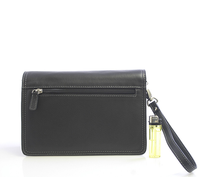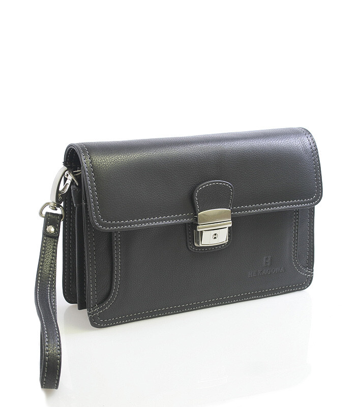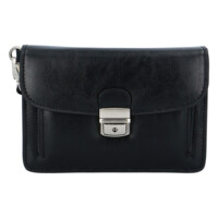 Pánské černé kožené etue Hexagona s klopou na zámeček. Uvnitř dvě hlavní přihrádky plus jedna přihrádka na přední straně. Další dvě kapsičky jsou na zip. Etue pojme peněženku, telefon, klíče a další nezbytné věci. Zezadu je další kapsička na zip. Součástí je kožené odnímatelné poutko na ruku.