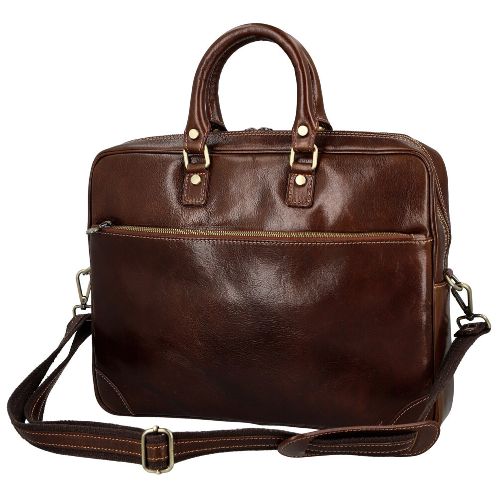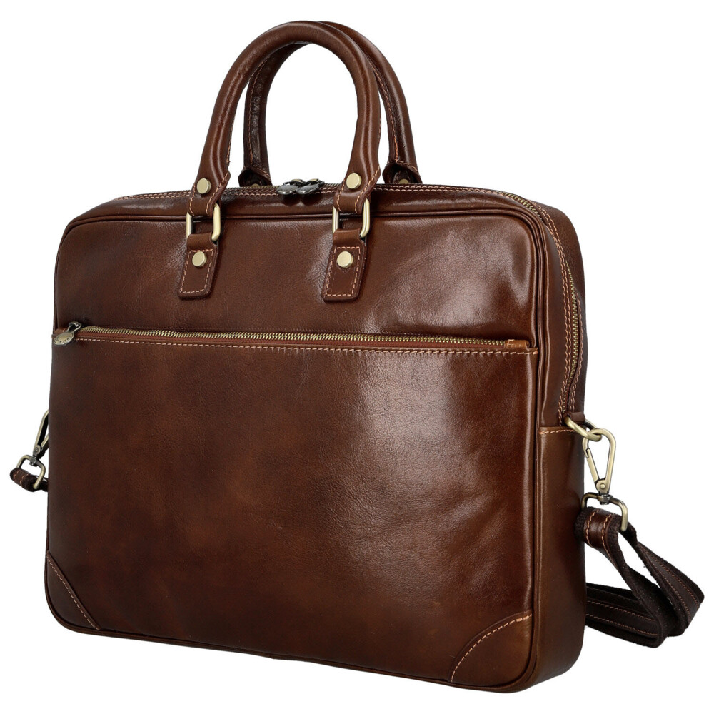 Elegantní síla v každém detailu. Tato kožená business taška je stvořená pro dny, kdy potřebujete mít přehled, styl i tempo. Hladký kožený povrch a čistý design působí sebevědomě a profesionálně, bez zbytečných okras. Hlavní kapsa na zip nabízí přehledný řešený vnitřní prostor s kapsičkami v podšívce, které udrží dokumenty i pracovní nezbytnosti perfektně uspořádané. Praktické velké zipové kapsy v přední i zadní části jsou ideální pro věci, které chcete mít ihned po ruce. Pevná ucha skvěle padnou do ruky a nastavitelný ramenní popruh zajistí pohodlí i při celodenním nošení. Mosazné kování dodává tašce moderní business charakter s nádechem luxusu. Taška, která drží krok s vašimi cíli. Objednejte ještě dnes a vyzkoušejte, vrátit ji můžete až za 30 dnů!