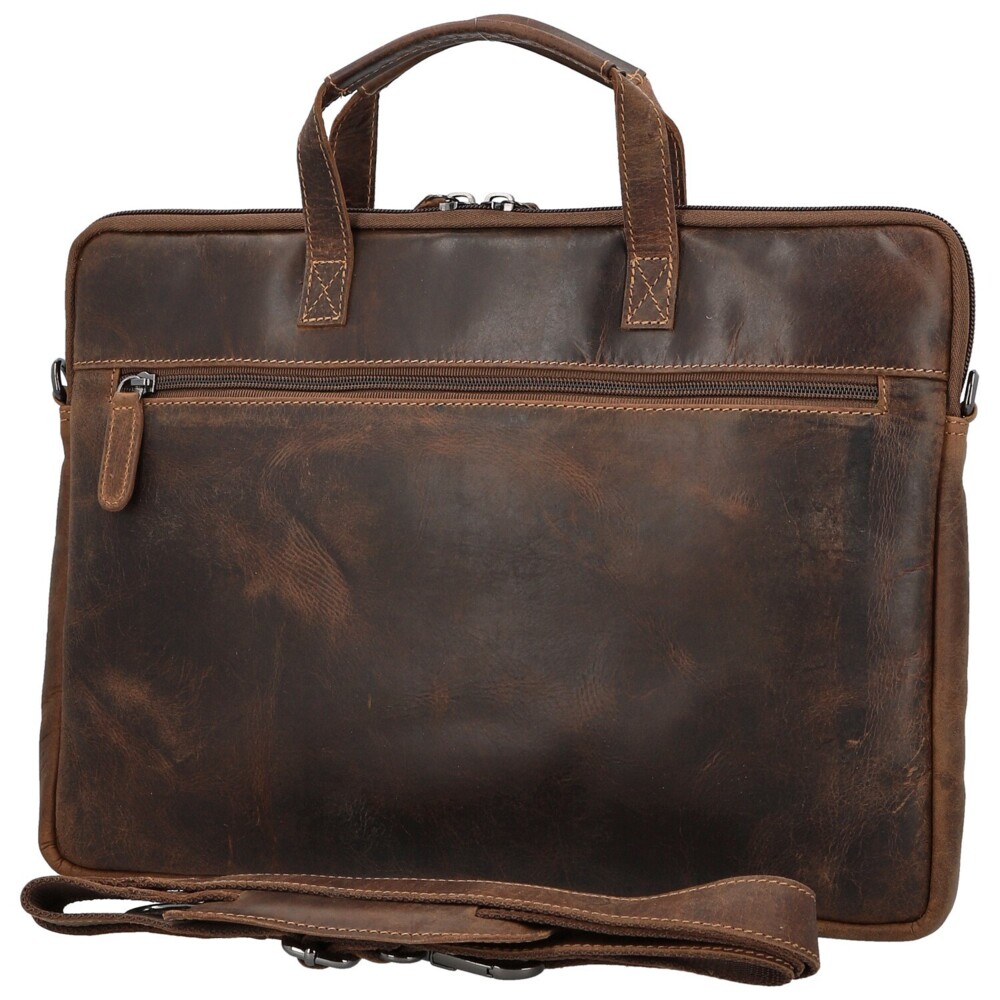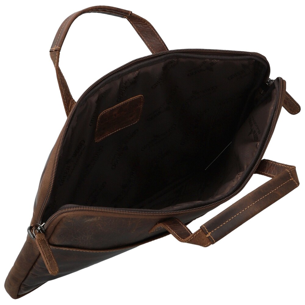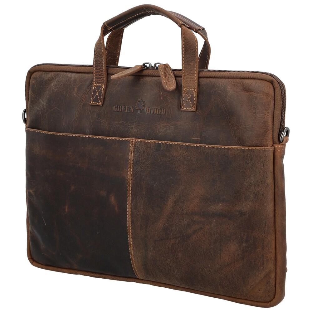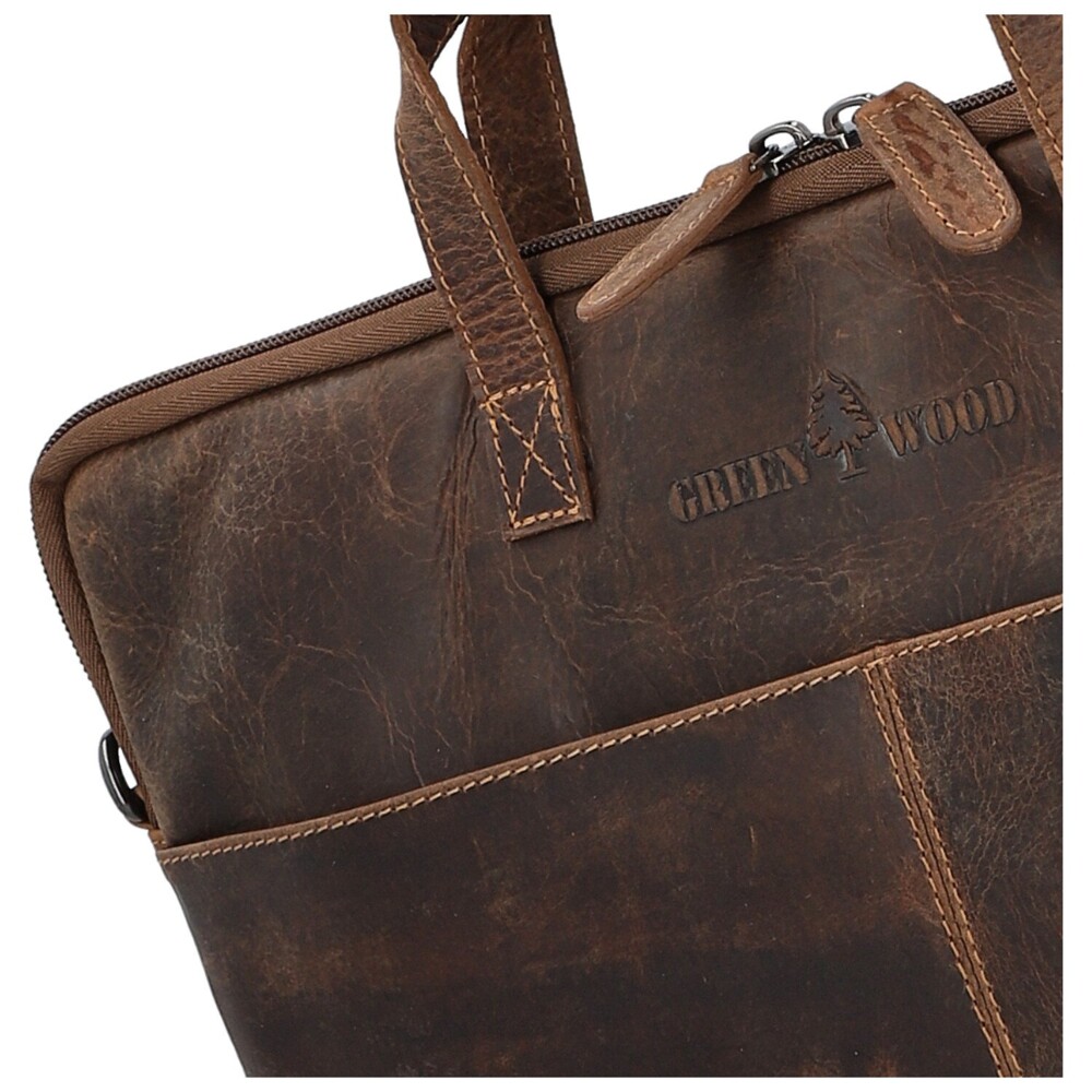 Moderní kožená business taška na notebook značky Greenwood spojuje elegantní vzhled s praktičností, kterou ocení každý profesionál. Vyrobena z kvalitní pravé kůže s jemnou strukturou. Její štíhlý tvar je navržena tak, aby perfektně pojal notebook nebo dokumenty. Na přední straně je umístěno logo značky a diskrétní otevřená kapsa. Zadní strana nabízí zipovou kapsu. Hlavní prostor je uzavíratelná na zip a poskytuje dostatek místa pro notebook i pracovní nezbytnosti. Taška má pevná ucha pro nošení v ruce a odnímatelný, délkově nastavitelný popruh. Elegantní vzhled doplňuje tmavě stříbrné kování. Perfektní volba pro každodenní práci. Objednejte ještě dnes a vyzkoušejte, vrátit ji můžete až za 30 dnů!