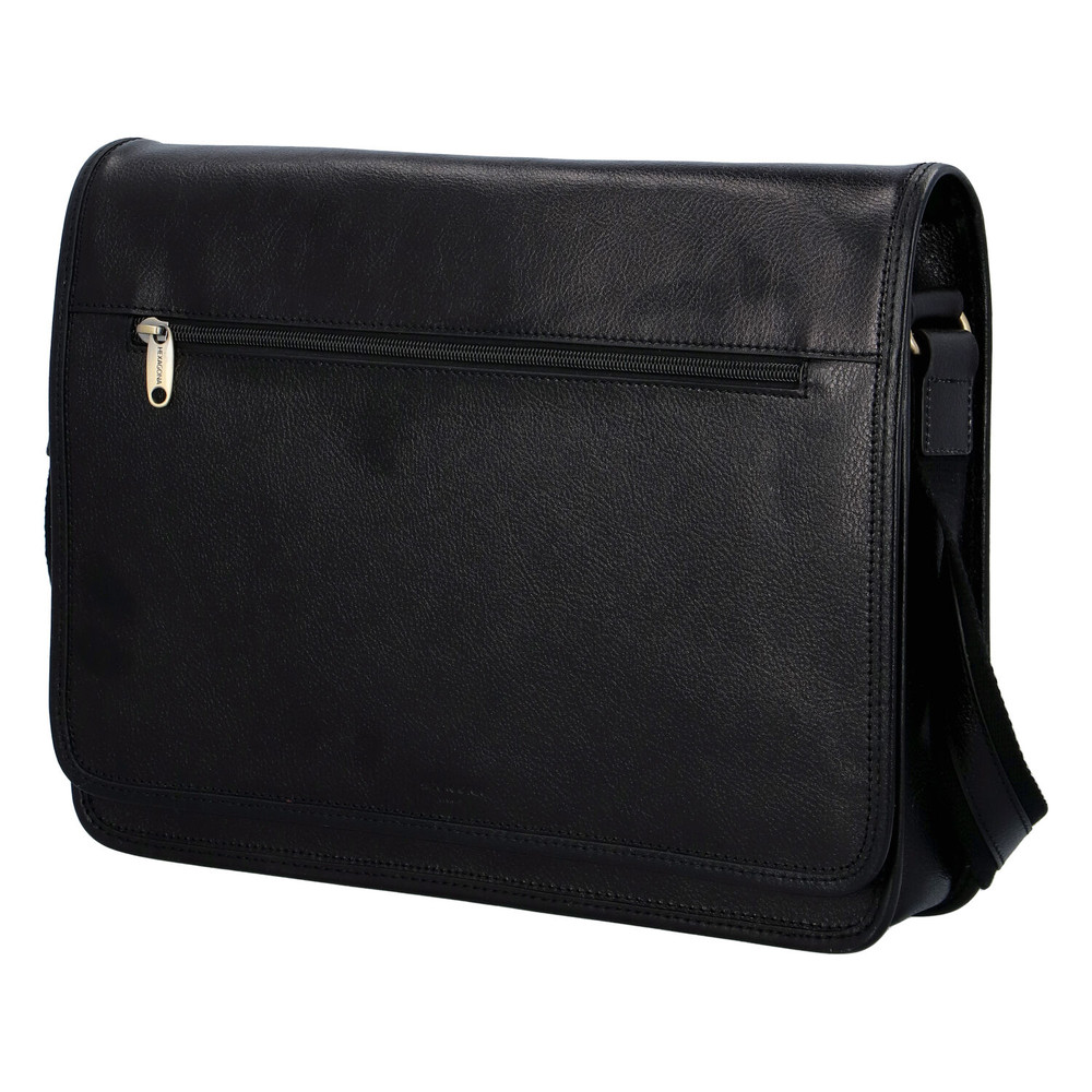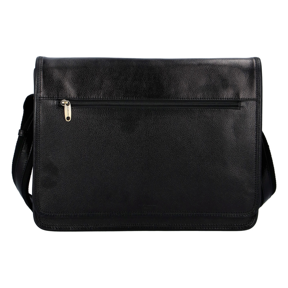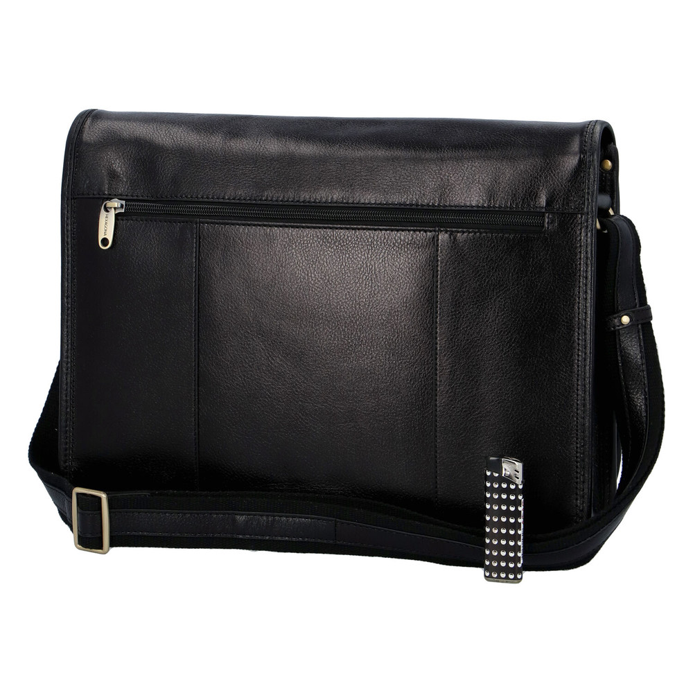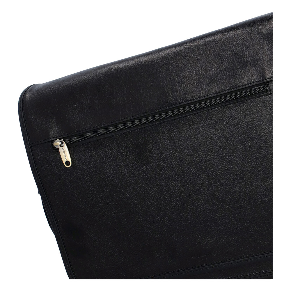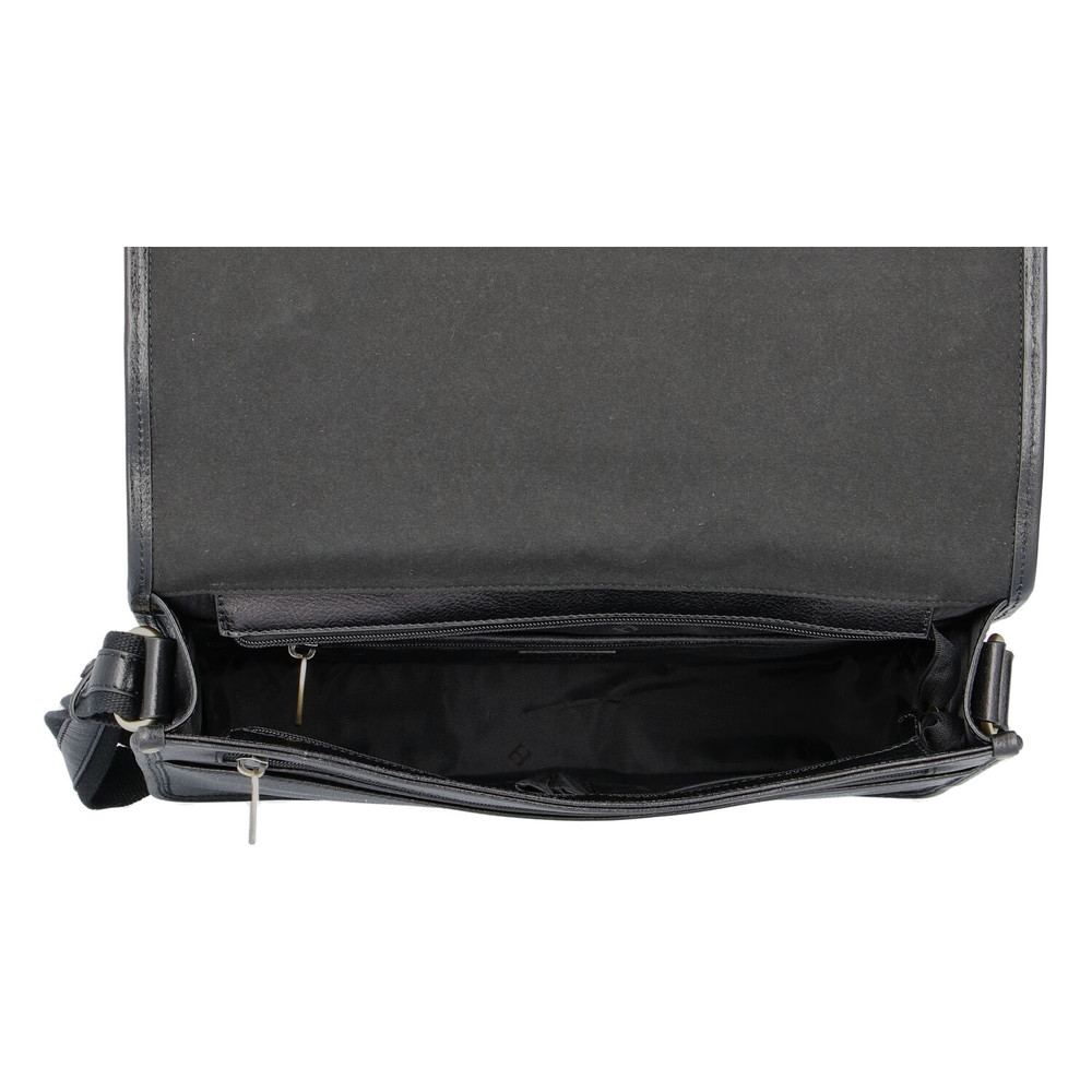 Černá celokožená taška pro muže, od značky Hexagona. Luxusní a kvalitní model, který je elegantní a stylový. Hodit se Vám bude samozřejmě nejen v práci, ale i ve městě. Nosit ji lze pohodlně přes rameno nebo crossbody. Pohodlně sem uložíte spisy, osobní věci i notebook (max. 33,5 x 24 cm). Taška se otevírá klopou s magnetickým cvokem, má perfektně lemované a prošívané okraje. Pod klopou jsou dvě velké kapsy, jedna volná a jedna se zipem. Hlavní kapsa se zapíná zipem a kromě kapsy na notebook zde najdete středně velkou kapsu na zip a menší volné kapsičky na osobní věci jako je telefon a pera. Zadní strana brašny je prošívaná a nechybí jí kapsa se zipem. Popruh je v kombinaci textilu a kůže. Dopřejte si skutečně mužskou záležitost.