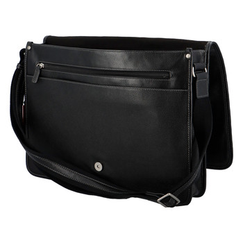 Černá celokožená taška pro muže, od značky Hexagona. Luxusní a kvalitní model, který je elegantní a stylový. Hodit se Vám bude samozřejmě nejen v práci, ale i ve městě. Nosit ji lze pohodlně přes rameno nebo crossbody. Pohodlně sem uložíte spisy, osobní věci i notebook (max. 36,5 x 25 cm). Taška se otevírá klopou s magnetickým cvokem, má perfektně lemované a prošívané okraje. Pod klopou jsou dvě velké kapsy, jedna volná a jedna se zipem. Hlavní kapsa se zapíná zipem a kromě kapsy na notebook zde najdete větší kapsu na zip a menší volné kapsičky na osobní věci jako je telefon a propisky. Zadní strana brašny je prošívaná a nechybí zde kapsa se zipem. Popruh je v kombinaci textilu a kůže. Dopřejte si skutečně mužskou záležitost. ▶ Skvělou volbou bude i tzv. "sestra" této brašny a to "Luxusní pánská kožená taška černá - Hexagona Pierre".