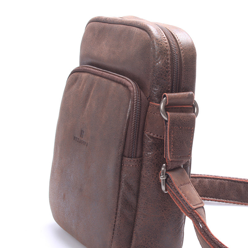 Představujeme vám novinku střední luxusní koženou tašku Hexagona ve hnědém provedení z kolekce 2016/2017. Elegantní taška na doklady a další různé potřebné věci je vyrobena z hovězí kůže té nejvyšší kvality, tentokrát ve vintage stylu. Kabelka má dvě hlavní přihrádky, jednu menší zepředu na zip (na mobil, tužky..) a druhou také na zip na peněženku a třeba pouzdro s brýlemi. Součástí je nastavitelný textilní popruh s koženým páskem. Na zadní straně je další menší kapsička na mg. cvoček.