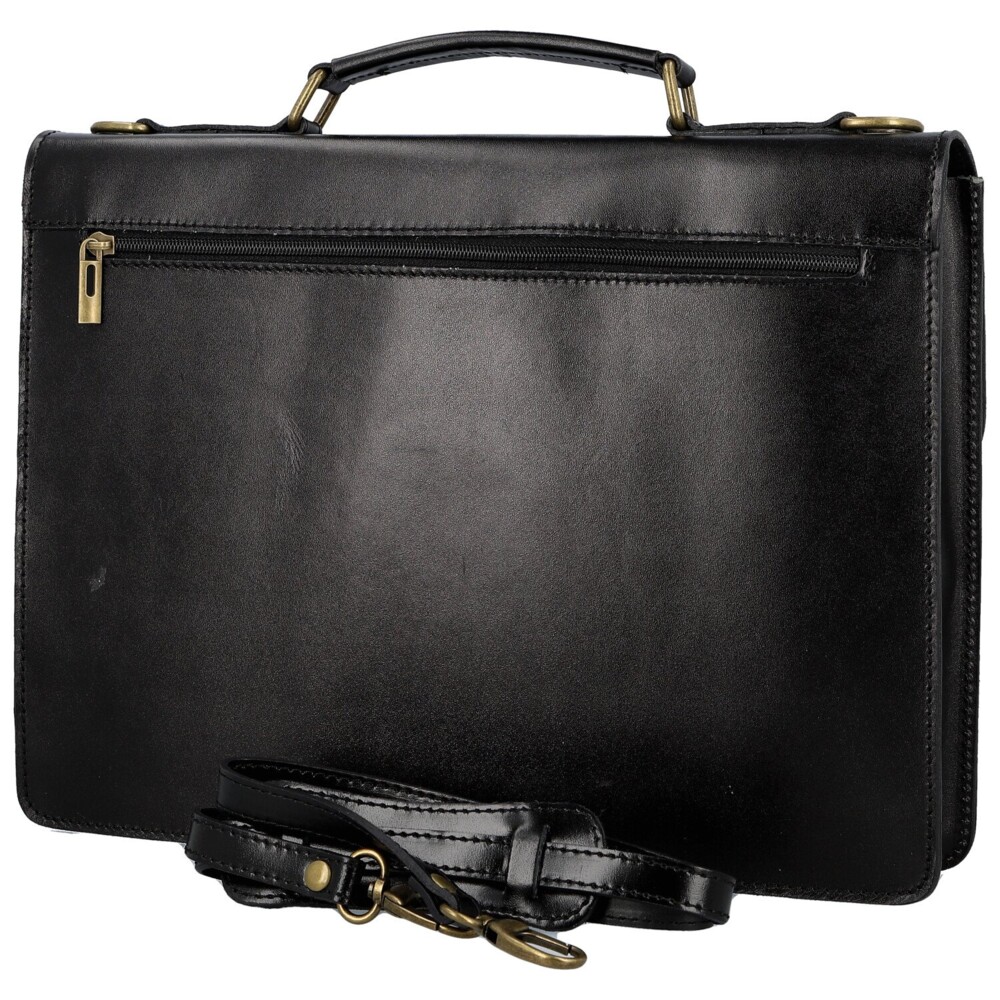 Tato kožená aktovka je dokonalou kombinací elegance, kvality a funkčnosti pro každodenní profesionální použití. Přední klopa, která sahá do poloviny přední strany, je vybavena pevnějším mosazným zapínáním, jež dodává aktovce sofistikovaný a nadčasový vzhled. Po otevření klopy se odhalí prostorná hlavní kapsa, ideální pro dokumenty, tablet nebo jiné pracovní potřeby, a vpředu se nachází zipová kapsička. Na zadní straně aktovky je praktická zipová kapsa pro rychlý přístup. Pevné ucho umožňuje pohodlné nošení v ruce, zatímco dlouhý kožený popruh se dá připnout pro elegantní nošení přes rameno. Mosazné kování dodává aktovce stylový, luxusní akcent. Objednejte ještě dnes a vyzkoušejte, vrátit ji můžete až za 30 dnů!