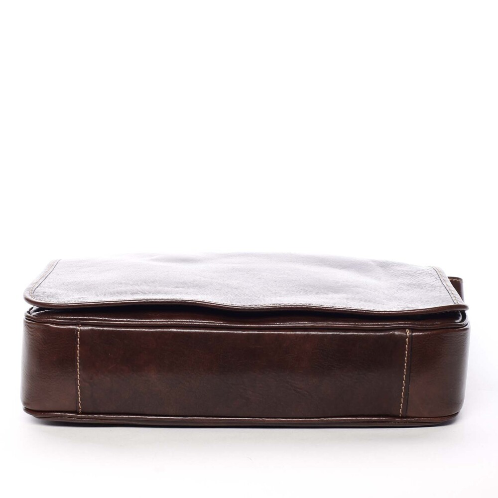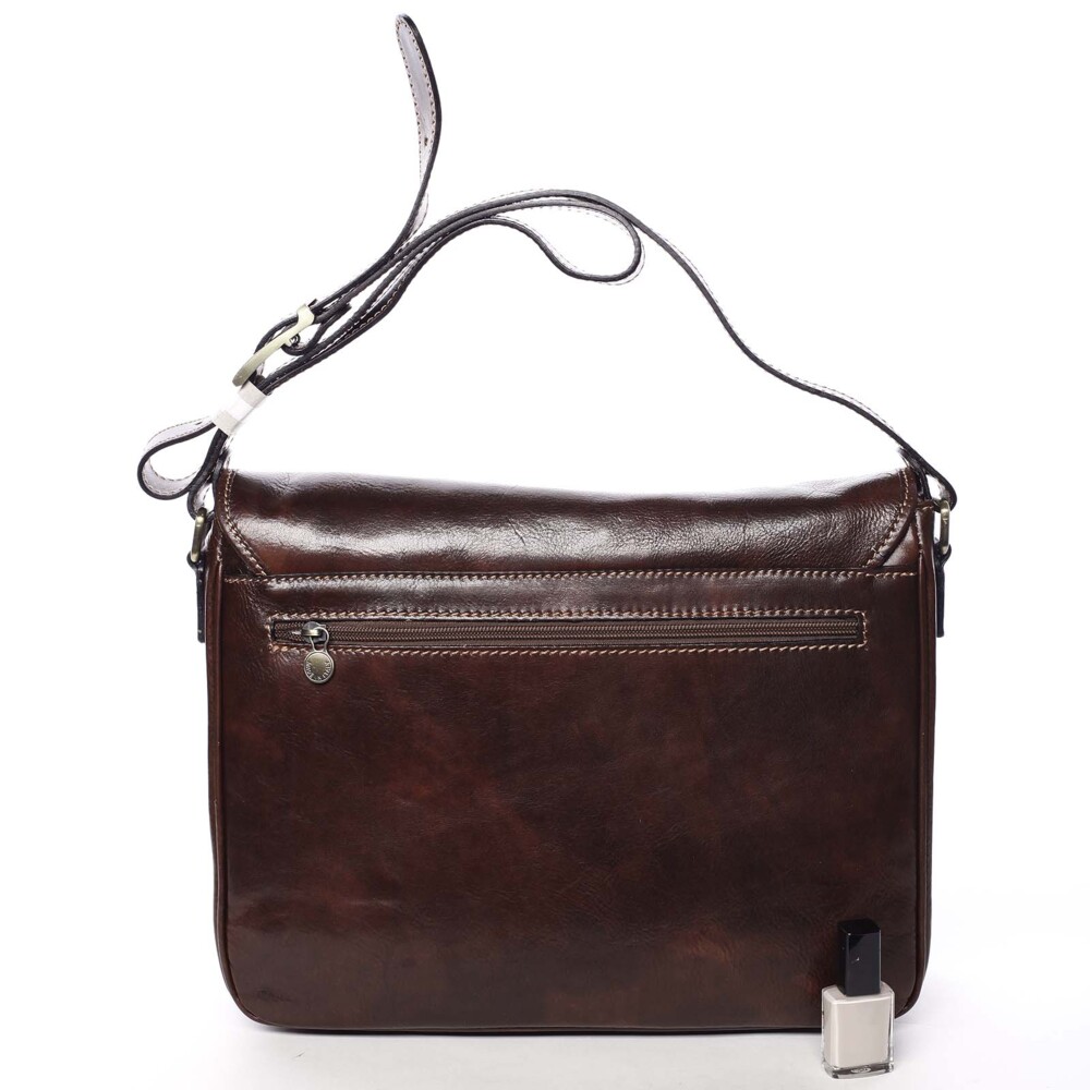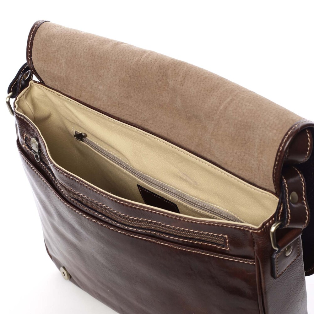 Velká, moderní a prostorná pánská kožená taška. Krásné nadčasové provedení s kontrastním prošíváním a kvalitní kůže zajistí dlouhou životnost výrobku a praktické nošení během celého dne. Taška má klopu na druky, uvnitř velká hlavní kapsa nabízí mnoho místa na vše potřebné. Dále jsou tu dvě menší kapsy, jedna na zip. Zadní strana nabídne také kapsu na zip. Popruh je dlouhý, pro pohodlné nošení s možností regulace. Kování je mosazné a skvěle se hodí k tašce. Objednejte ještě dnes a vyzkoušejte, vrátit ji můžete až za 30 dnů!