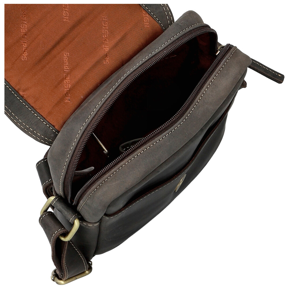 Menší pánská kožená crossbody taška Sendi Design z kvalitní broušené kůže je ideálním doplňkem pro každodenní nošení. Jednoduchá a elegantní klopa ukrývá hlavní kapsu na zip, ve které najdete praktické postranní přihrádky a jednu volnou kapsičku na drobnosti. Na zadní straně tašky se nachází další kapsa na zip, vhodná například na telefon, doklady nebo jiné cennosti.