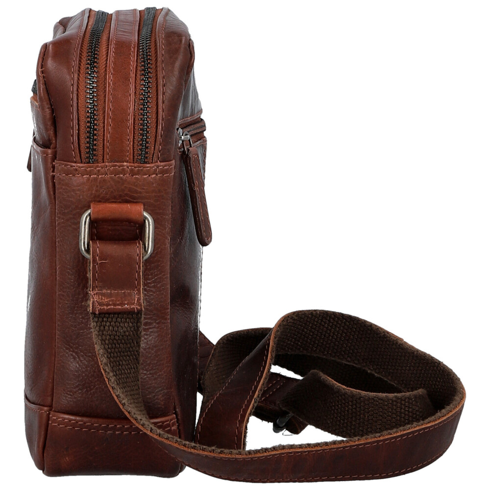 Pánská kožená crossbody taška zaujme svou praktickou konstrukcí i stylovým vzhledem. Na přední straně najdete šikovnou zipovou kapsičku pro drobnosti, kterou doplňuje prostorná otevřená kapsa - ideální místo pro věci, které chcete mít neustále po ruce. Celou přední část završuje logo značky, jemně vytlačené do kůže. Taška nabízí dvě hlavní zipové kapsy, takže vám poskytne dostatek prostoru i přehledné uspořádání. Uvnitř se nacházejí kapsičky v podšívce. Na zadní straně je umístěna ještě jedna zipová kapsa. Dlouhý popruh lze snadno nastavit podle potřeby, což zajistí maximální pohodlí při nošení přes rameno i křížem. Tmavě stříbrné kování skvěle doplňuje tón kůže a dodává tašce elegantní, lehce moderní vzhled. Objednejte ještě dnes a vyzkoušejte, vrátit ji můžete až do 30 dnů!