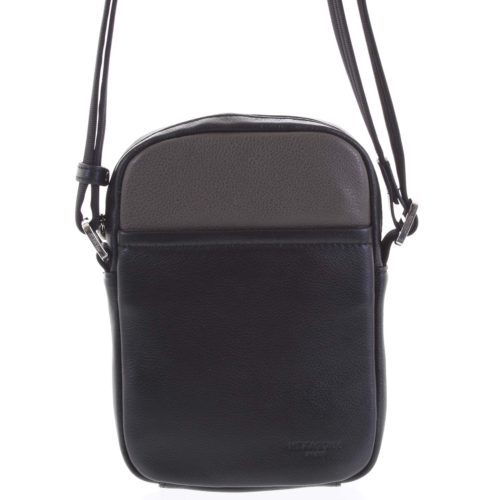 Představujeme vám horkou novinku od francouzské značky Hexagona. Kožená černá crossbody taška na doklady, s částí přední strany v tmavé taupe barvě, má moderní design a kvalitní, prošívaný, nylonový popruh. Je malá, pojme peněženku, klíče, mobil a doklady s drobnostmi. Hodit se Vám bude na cestách autem, ve městě i na krátkých procházkách. Kvalitní zboží, které vydrží! Udělejte sobě nebo vašemu blízkému radost tímto skvělým dárkem! Uvnitř hlavní kapsy na zip najdete volnou kapsu na telefon a malou kapsičku se zipem na drobnosti. Nenápadná středně velká kapsa na přední straně se otevírá magnetickým cvočkem.