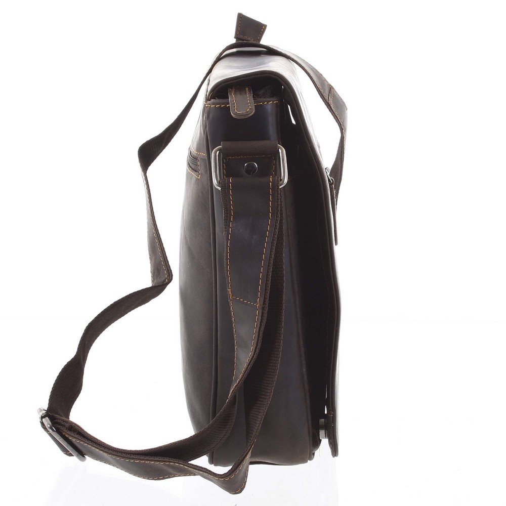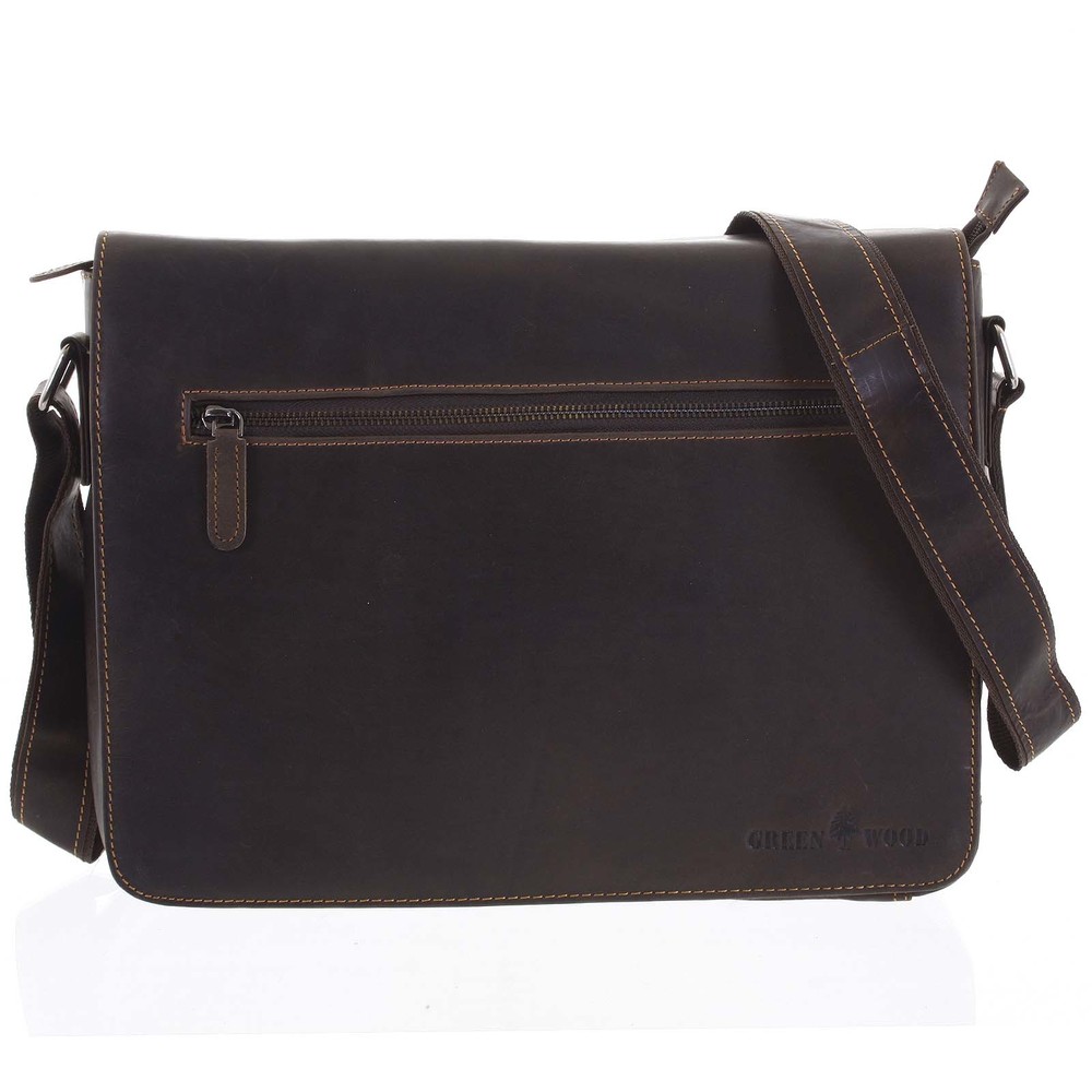 Tmavě hnědá luxusní kožená pánská taška přes rameno v broušené verzi s patinou, značky Greenwood, s klopou na dva magnetické cvoky. Klopa nabídne kapsu se zipem a ražené logo v dolním levém rohu. Pod klopou najdete velkou volnou kapsu s organizérem na telefon, vizitky a propisky. Hlavní kapsa je na zip, prostor dělí přepážka, ve formě kapsy na zip, na dvě úložiště, kam si lze dát notebook (max. 34 x 24 cm). Další kapsy jsou na zadní straně tašky, z vnější i vnitřní strany. Kabela je důkladně a ručně sešita a vyrobena. Popruh tašky je polokožený, podšitý jemným polyesterem, neodře Vám tak sako ani bundu. Menší skvrny, matné zbarvení či menší odřeninky (šrámy) nejsou vady kůže. Všechny tašky Greenwood mají patinu, časem a používáním se tedy krásně vyhladí. Drobné škrábance nejsou závadou kůže, časem a užíváním získají svůj individuální charakter a patinu. Objednejte ještě dnes a vyzkoušejte, vrátit ji můžete až za 30 dnů!