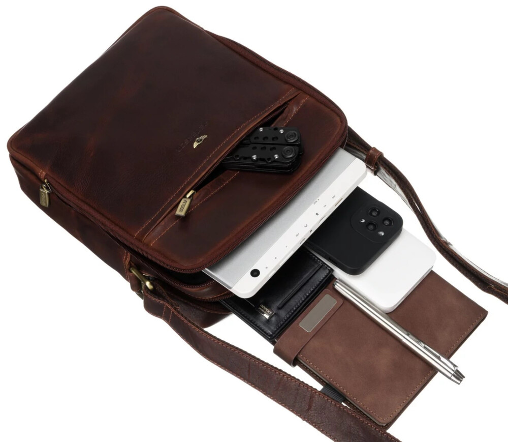 Kvalitní pánská crossbody taška z pravé kůže působí elegantně a nadčasově. V přední části ji zdobí zipová kapsa a decentní logo značky, které podtrhují její sofistikovaný vzhled. Taška má dvě hlavní kapsy, užší vhodnou na menší tablet a prostornější pro osobní věci, obě zajistíte zipy. Na zadní straně se nachází praktická otevřená kapsa pro rychlý přístup k drobnostem. Mosazné kování dodává tašce stylový vintage nádech, zatímco dlouhý kožený popruh umožňuje pohodlné nošení přes rameno nebo křížem. Objednejte ještě dnes a vyzkoušejte, vrátit ji můžete až za 30 dnů!