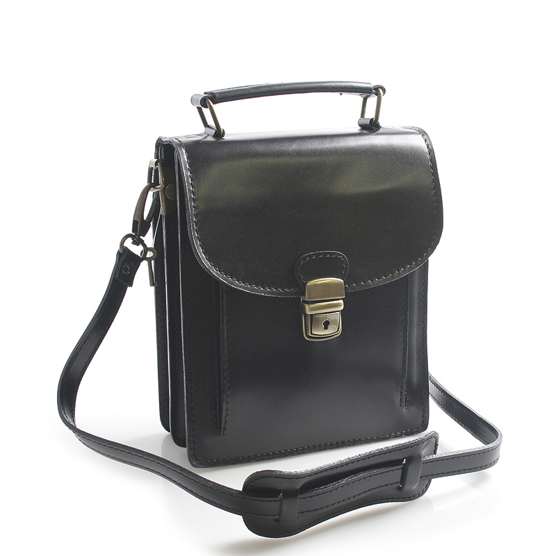 Pánské luxusní černé kožené etue na výšku s uchem italské značky ItalY. Uvnitř dvě hlavní přihrádky plus jedna přihrádka na přední straně. Etue pojme peněženku, telefon, klíče a další nezbytné věci. Součástí je odnímatelný kožený popruh přes rameno. Novinka 2016, pokračující rokem 2018.