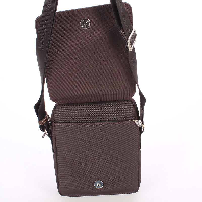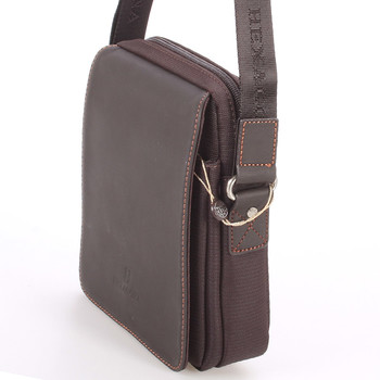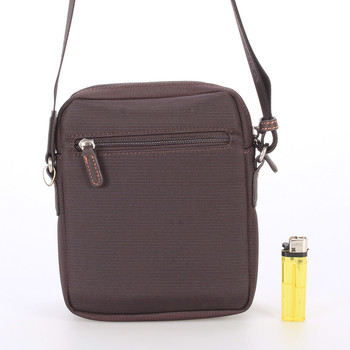 Tmavě hnědá pánská taška přes rameno Hexagona na doklady. Hlavní kapsa na zip, uvnitř kapsa se zipem. Pod klopou jedna kapsa bez zipu. Součástí tašky je nastavitelný popruh z nylonu. Materiál - hovězí kůže (klopa + úchyty popruhu), nylon.