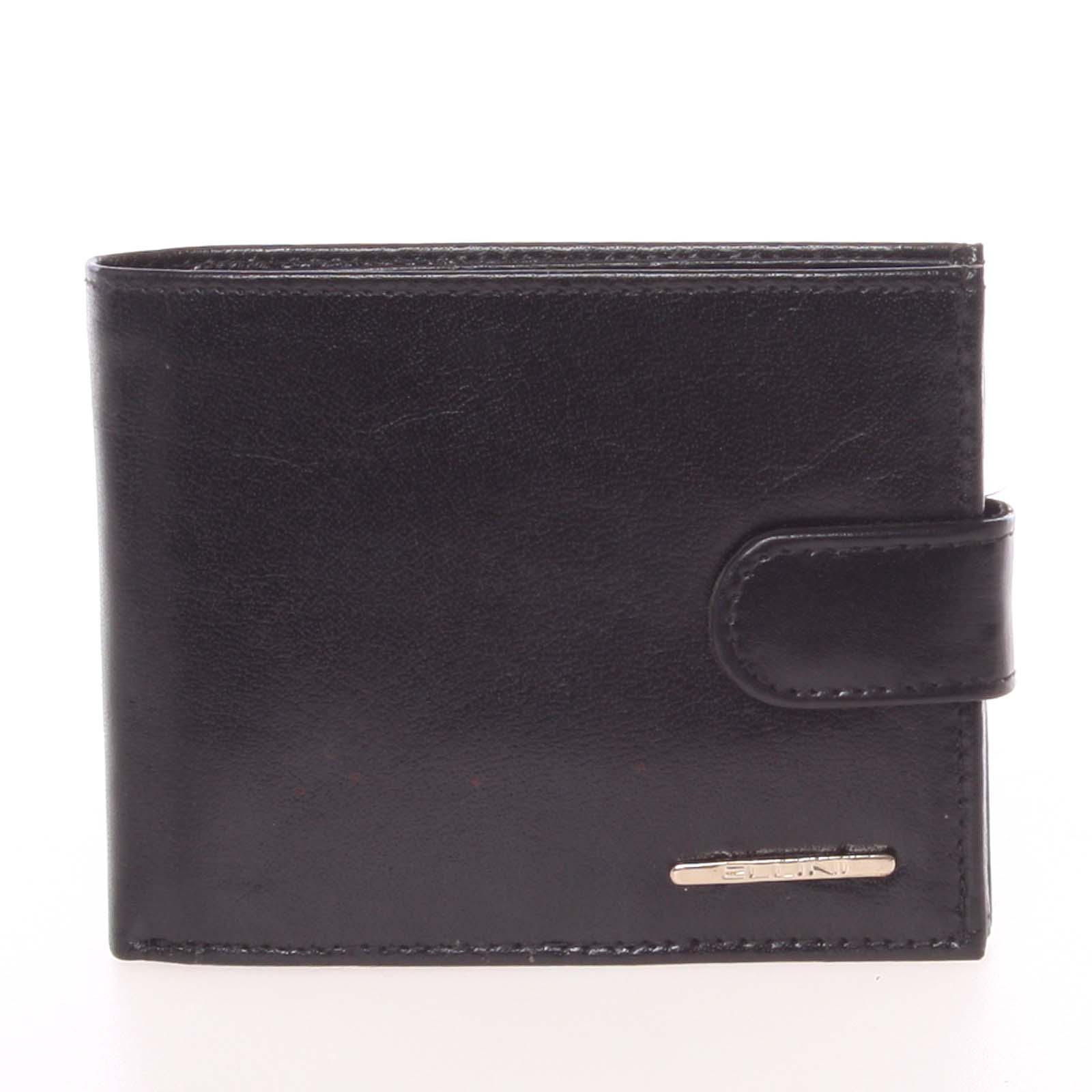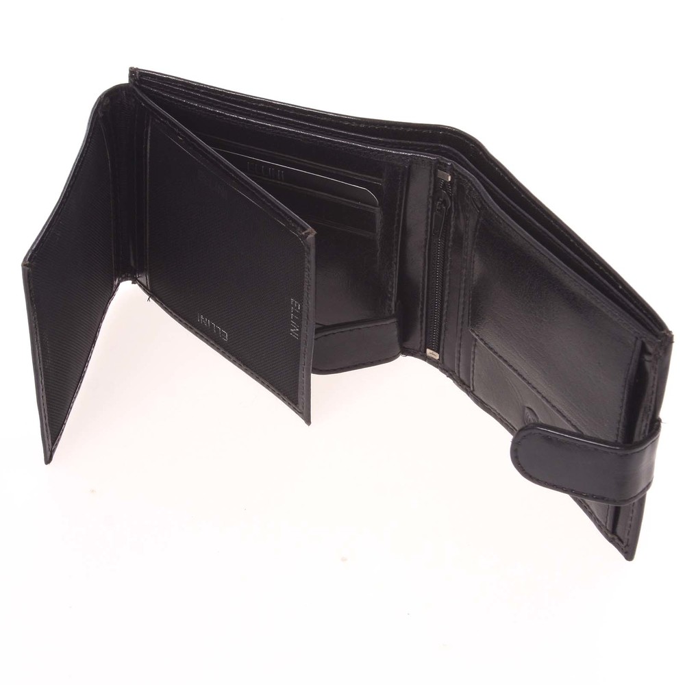 Elegantní prošívaná černá pánská kožená peněženka Ellini. Tahle kožená peněženka která působí luxusním dojmem a přitom je za rozumnou cenu, Vás bude reprezentovat opravdu při každé příležitosti. Vejdou se do ní mince, bankovky, samozřejmě také kreditní karty, či doklady. Je zavíratelná na cvoček.