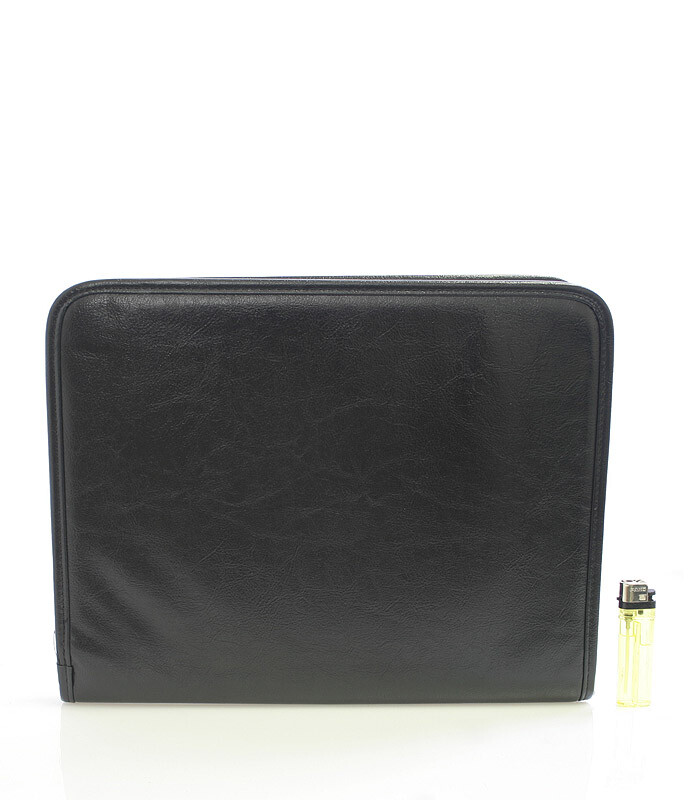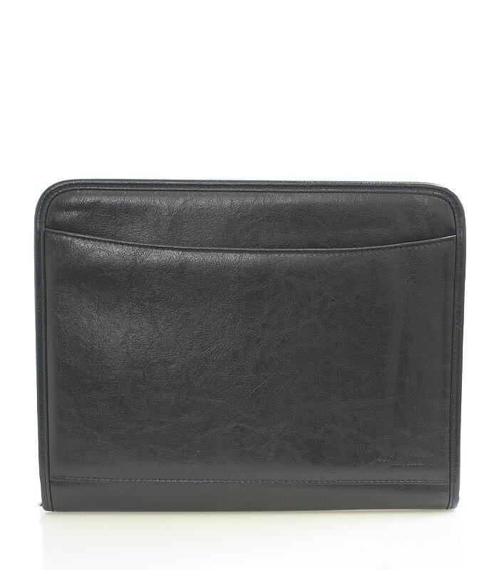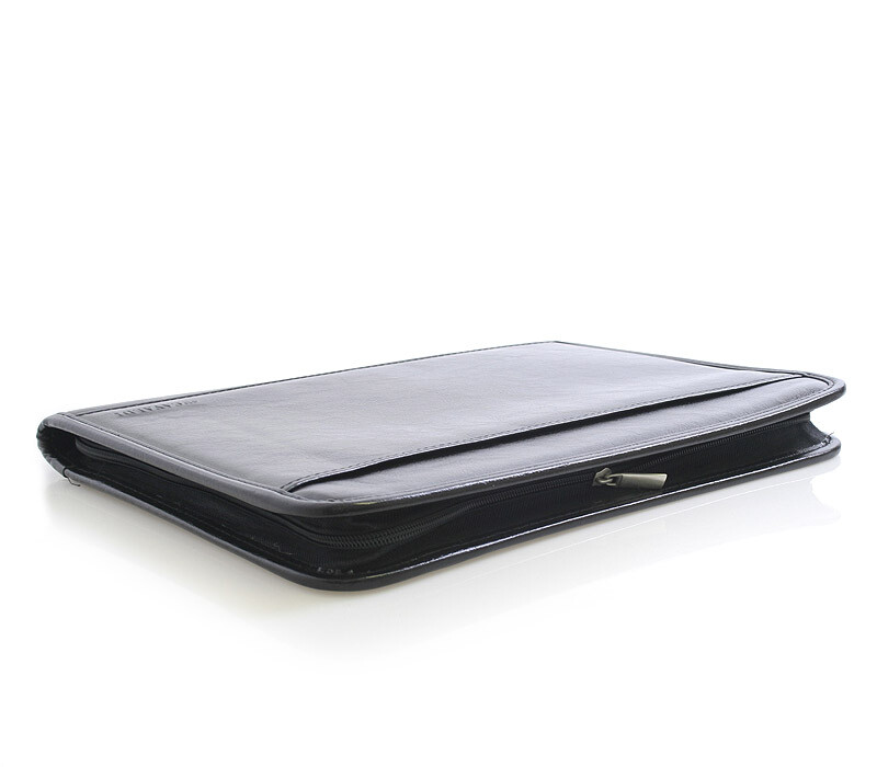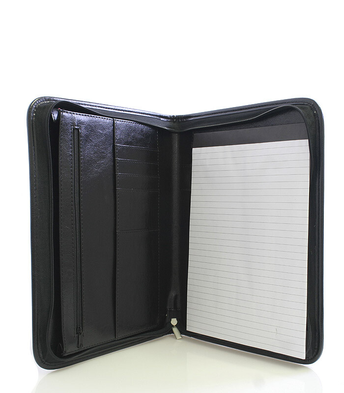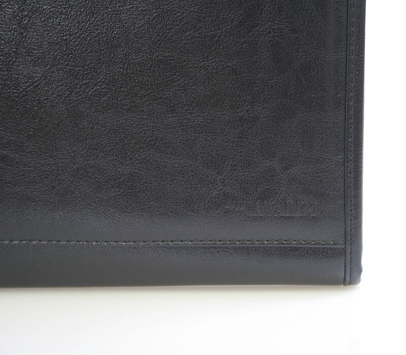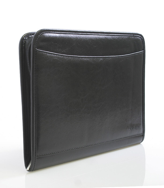 Elegantní černá spisovka s poznámkovým blokem Cavaldi bez ucha. Spisovku lze nosit pouze v ruce. Otevírá se zipem po obvodě. Uvnitř je poznámkový blok (odnímatelný) a další kapsy na drobnosti. Na přední straně je kapsa na A4 bez zipu.