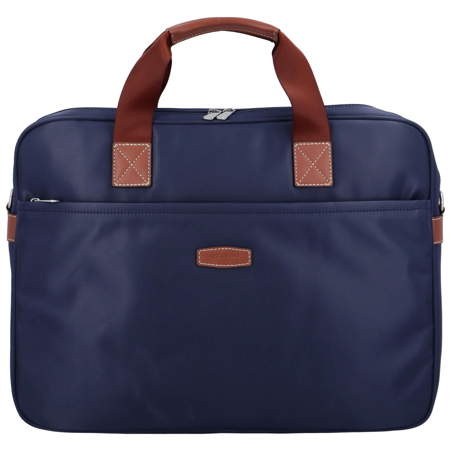 Luxusní pracovní brašna od značky Hexagona s koženými detaily. Multifunkční, moderní, lehká taška na notebook. Užívat ji mohou pánové i dámy. Skvěle padne k obleku, kostýmku i ležérnějšímu oblečení. Má tmavě modrou barvu s lehkým odleskem materiálu, hnědě zbarvené detaily, uši i popruh. U popruhu najdete kožené posuvné polstrování na rameno. Přední strana tašky nabídne velkou kapsu se zipem a také na zadní straně najdete kapsu na zip. Pod ní je přišito polyesterové poutko na madlo kufru. Cestování tak bude velmi jednoduché. Hlavní kapsa má duální zip, vnitřní prostor nabízí dvě volné, středně velké kapsičky a polstrovanou přihrádku na notebook (max. 40 x 30,5 cm). Ta je ukotvená pásem se suchým zipem.