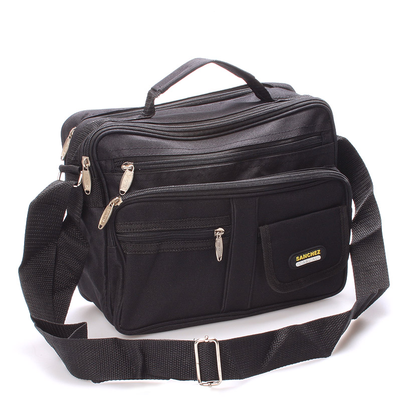 Černá střední pánská kabela přes rameno Sanchez s nastavitelným popruhem a uchem. Taška má spoustu kapes na zip, dáte do ní vše co potřebujete. Novinka.
