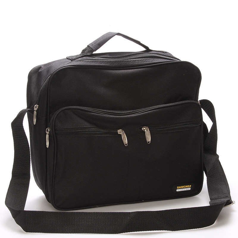 Černá střední pánská kabela přes rameno Sanchez s popruhem a uchem. Taška má zepředu tři kapsy na zip. Ideální pro rozměr A4. Uvnitř je nedělený prostor bez kapes. Novinka 2016.